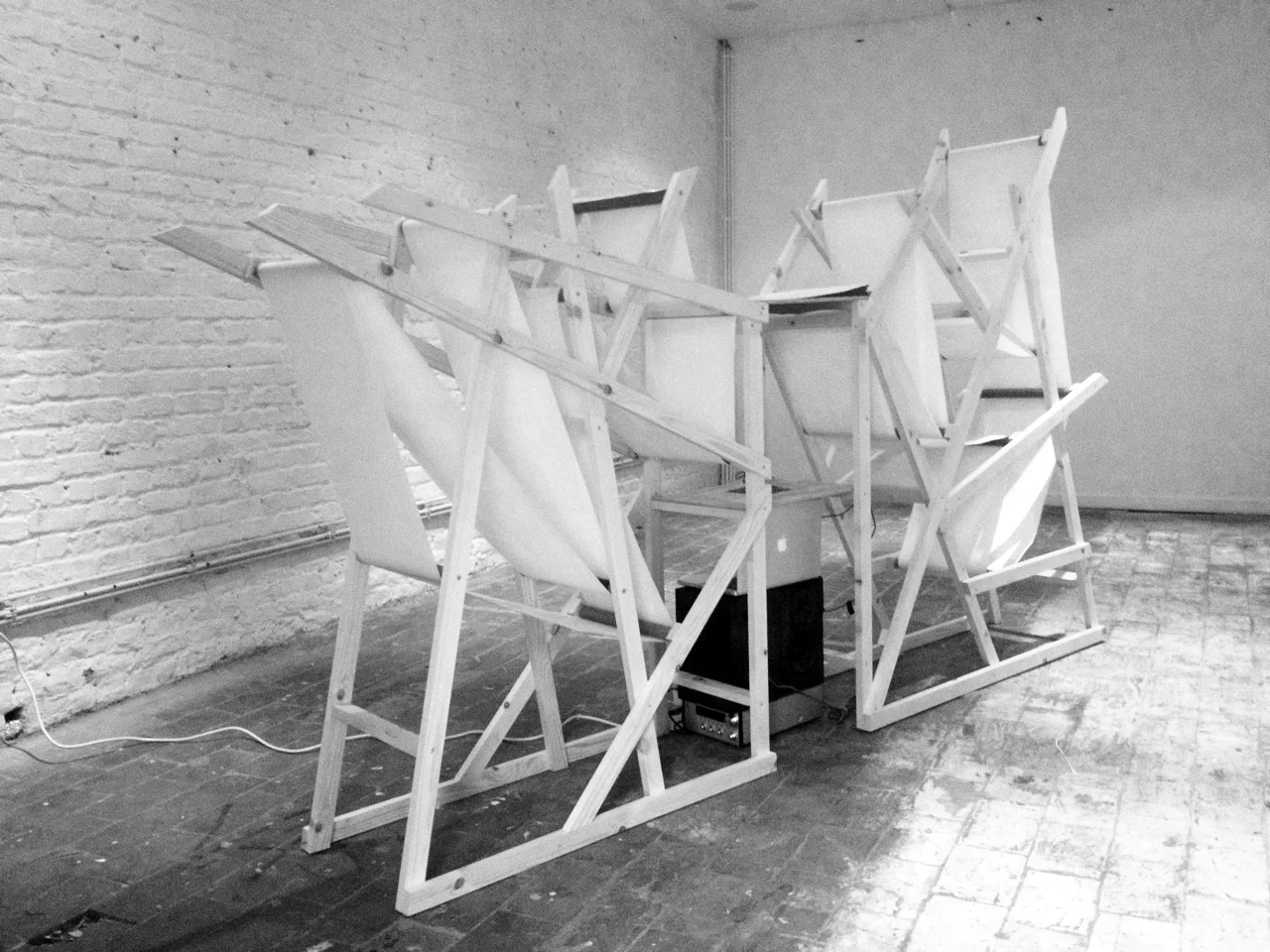 It is through a strange machine that sounds arise, activated by a performer. On a strip of Japanese paper, which is pulled through a wooden structure by a system of pulleys, the performer inscribes in Indian ink the information from which sounds will be triggered. It's the accumulation of drawing on the paper, an infinite strip, which will produce the growth of the sound little by little. Fragile sounds, captured in the same space as the action, take back life revealing themselves suddenly as a universe that has otherwise escaped us.